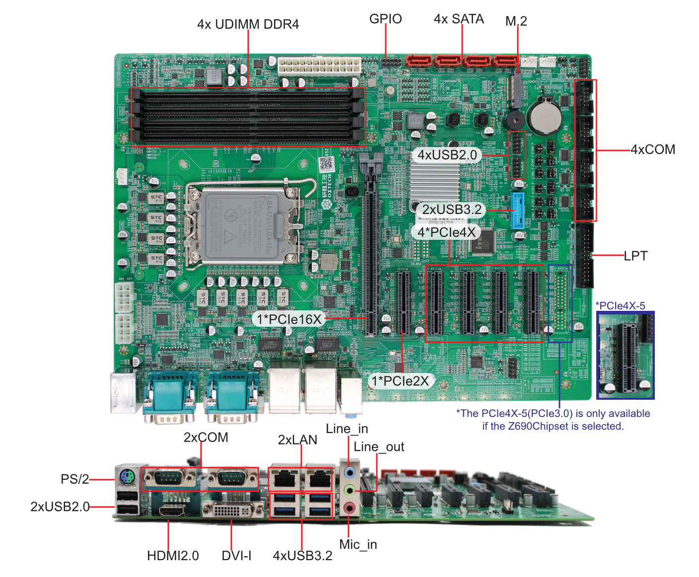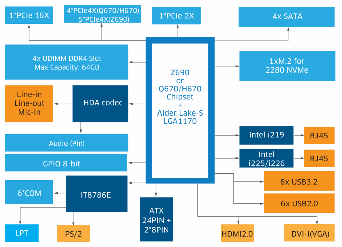 Expansion: 1*PCIe2X, 1*PCIe16X, 5*PCIe4X(Z690) or 4*PCIe4X(Q670/H670)