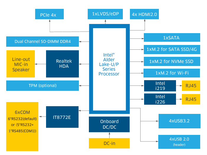 AL-10 Mini-ITX主板,搭载Intel? Alder Lake-U/P 系列处理器,不仅在计算与图形处理方面表现强劲,更具备卓越的四显输出能力。同时,它配备了双千兆网口、多个USB接口及多个COM口,可广泛满足工业互联与多功能扩展需要,为各类嵌入式应用提供稳定可靠的硬件解决方案。