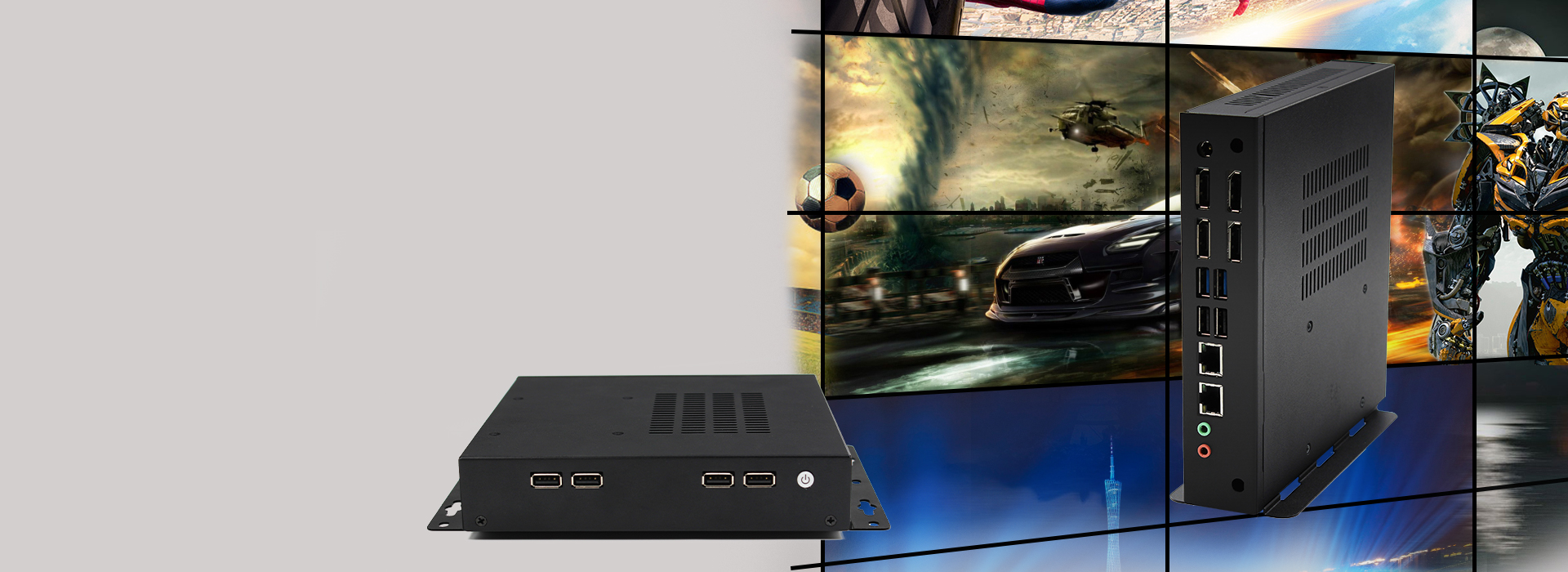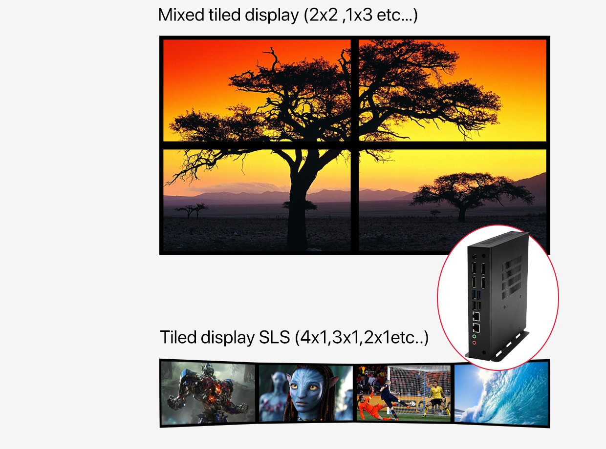 The 4xDP interfaces can support the Eyefinity technology, including tiled display SLS (4x1,3x1,2x1etc..) & mixed Tiled display (2x2 etc…). Thus the AIV1605 is an ideal solution for applications requiring high-resolution and multi-display products, like electronic gaming machines, medical imaging, interactive digital signage, thin clients, or PDS terminals. The AIV1605 can also act as a high speed communications front-end like a mini-server.