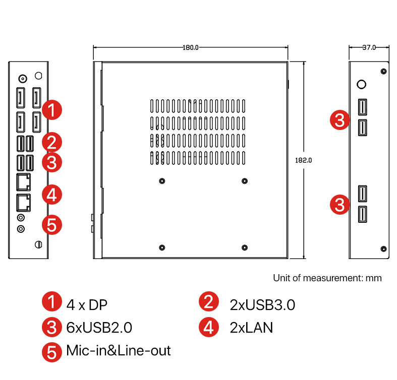 Rich I/O Ports: 4xDP, 2xUSB3.0, 6xUSB2.0, 2xLAN, Mic-in, Line-out